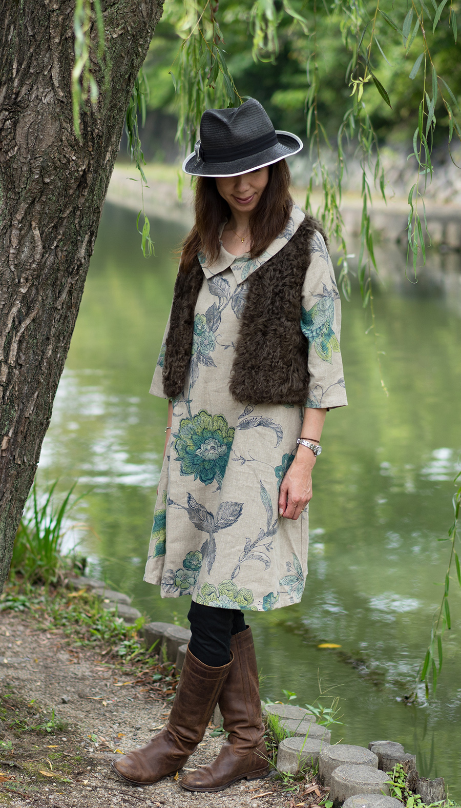 シックな柄のワンピースにファーの付いたベストでエレガントさを演出。ブーツやハットと合わせても着こなすことが出来ます。
