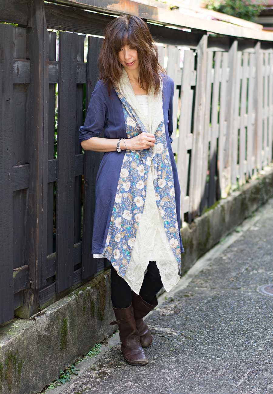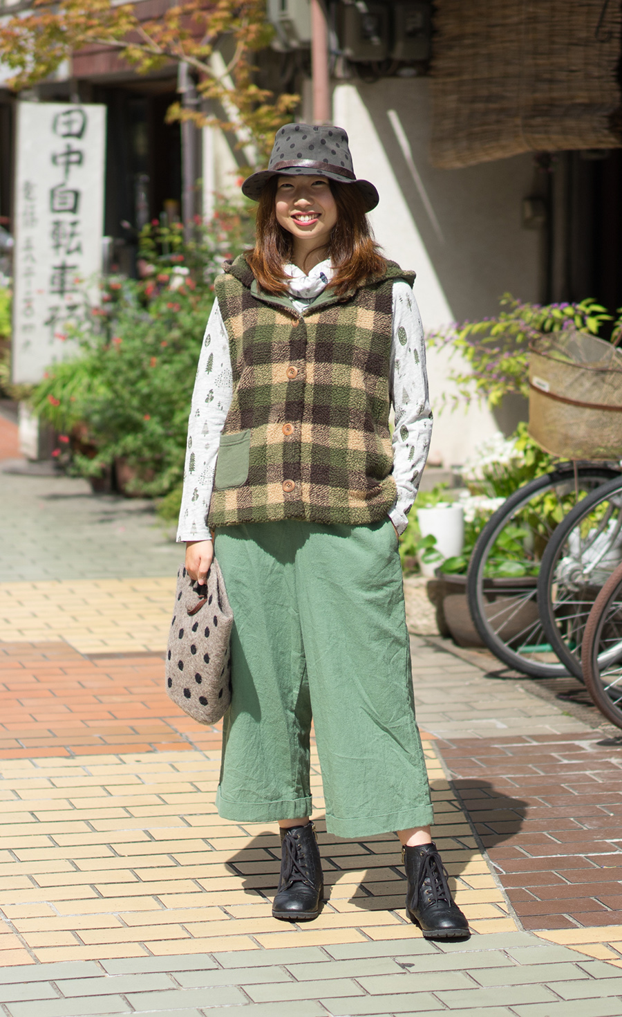 柄のトップスに明るいカーキのパンツをあわせて明るい印象を与えながら、アースカラーのベストで全体をまとめています。黒のショートブーツで引き締めています。